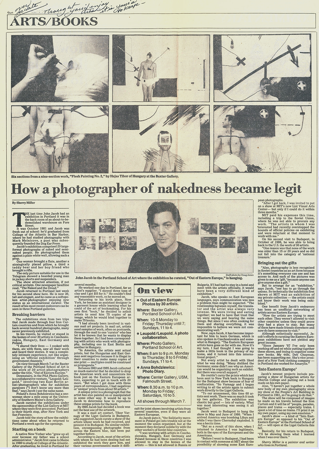 In conjunction with Out of Eastern Europe, Jacob organized one-person exhibitions by Anna Bohdziewicz at the Photographic Resource Center, Boston, MA, the Area Gallery, University of Southern Maine, Portland, and the Red Eye Gallery, Rhode Island School of Design, Providence; by Matthias Leupold (GDR) at the Maine College of Art, Portland; and by Thomas Florscheutz (GDR) at the Anderson Art Gallery, Virginia Commonwealth University, Richmond, VA.