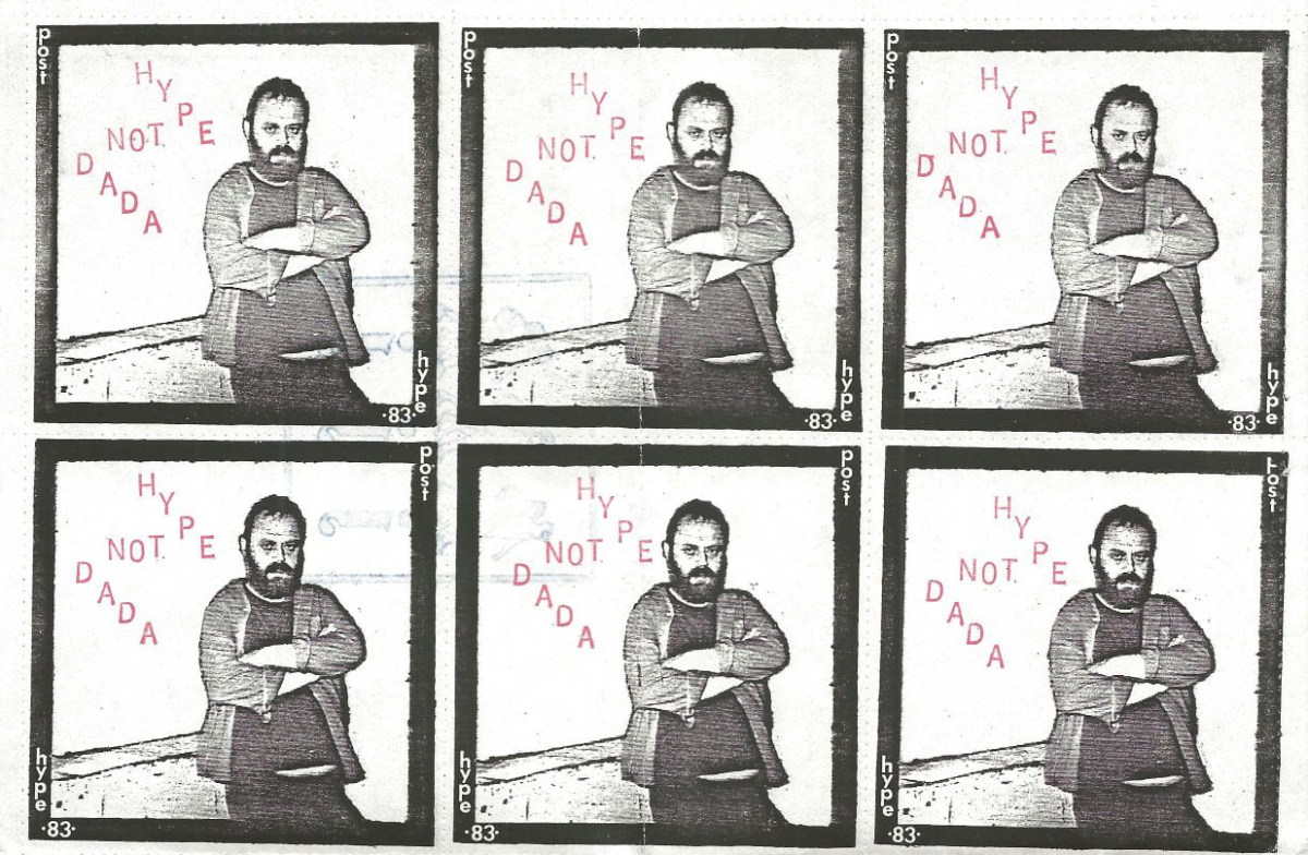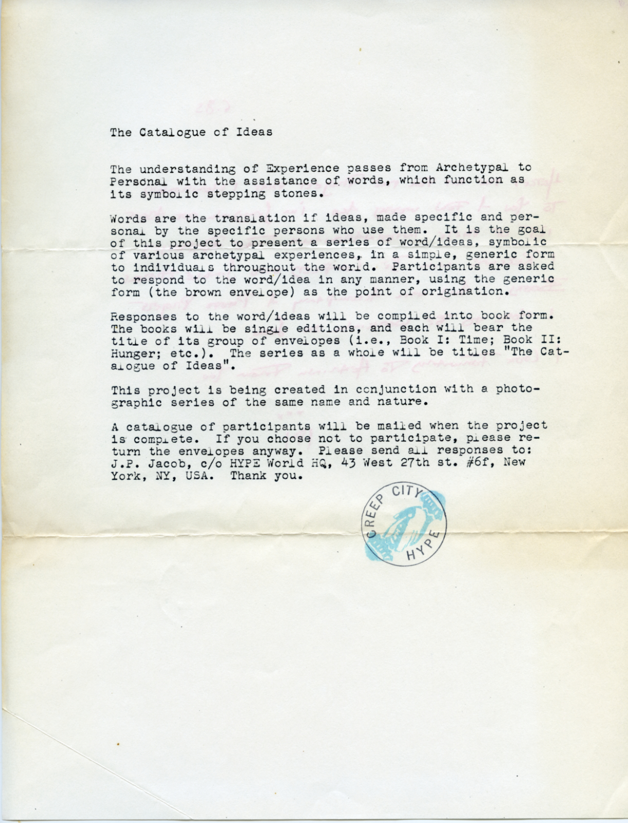 HYPE (Happy Young People Enterprises) was a friends network coordinated by Jacob after graduating from college. It was dedicated to mutual admiration and the fine art of the elaborate toast. PostHype was founded in 1981. The first issue was created, using pressed Letraset on paper, as a birthday gift to the artist Steven Durland, and modeled on his satirical mini-magazine Tacit. Early issues of PostHype were printed with an original rubber stamp, hand carved from photographs made using the photobooth machine at the Times Square arcade known as Playland, which recorded the visits of friends and other mail artists to New York City. Later issues expanded to document Jacob’s mail art activities.